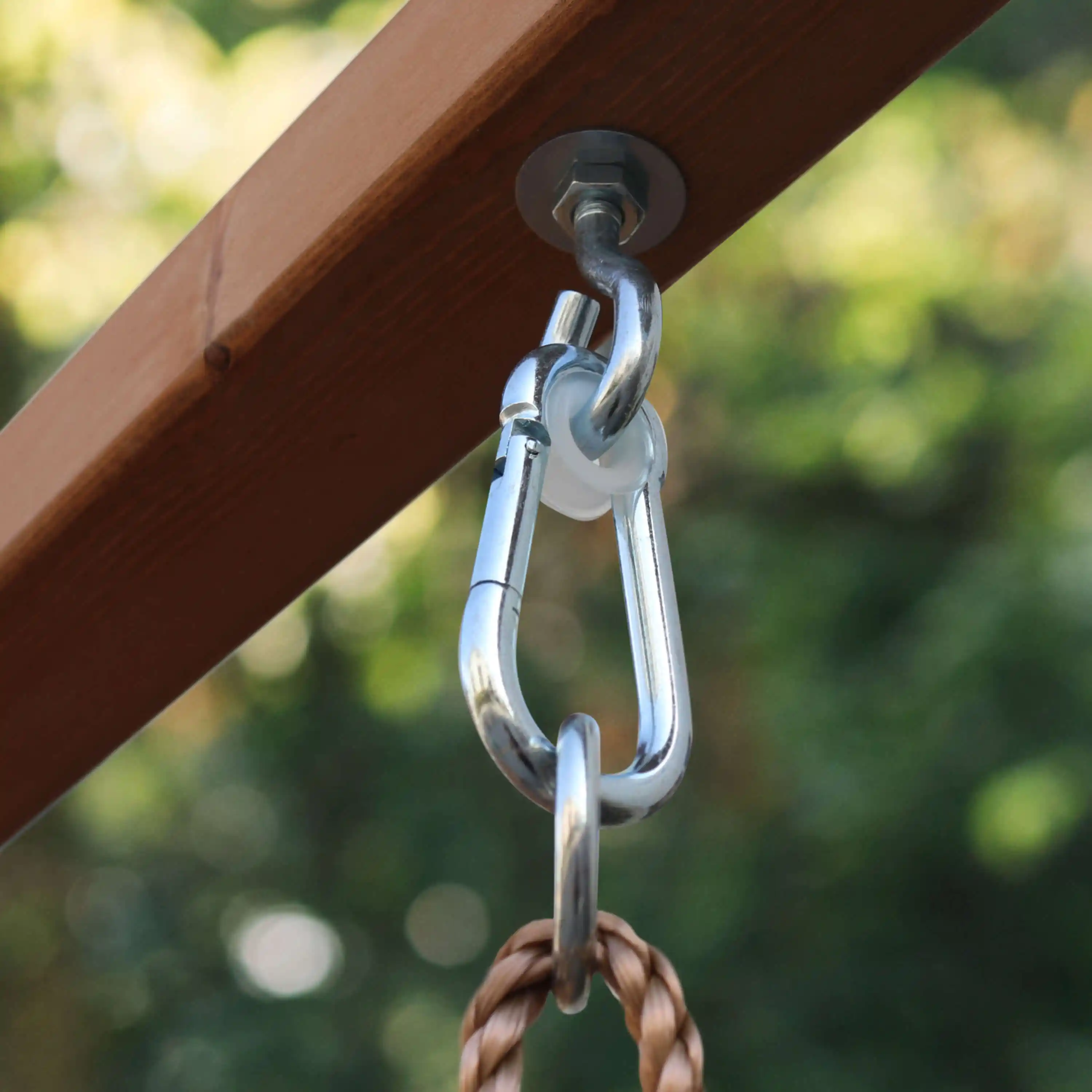 - Einzelschaukel mit einem höhenverstellbaren Schaukelsitz aus Holz.