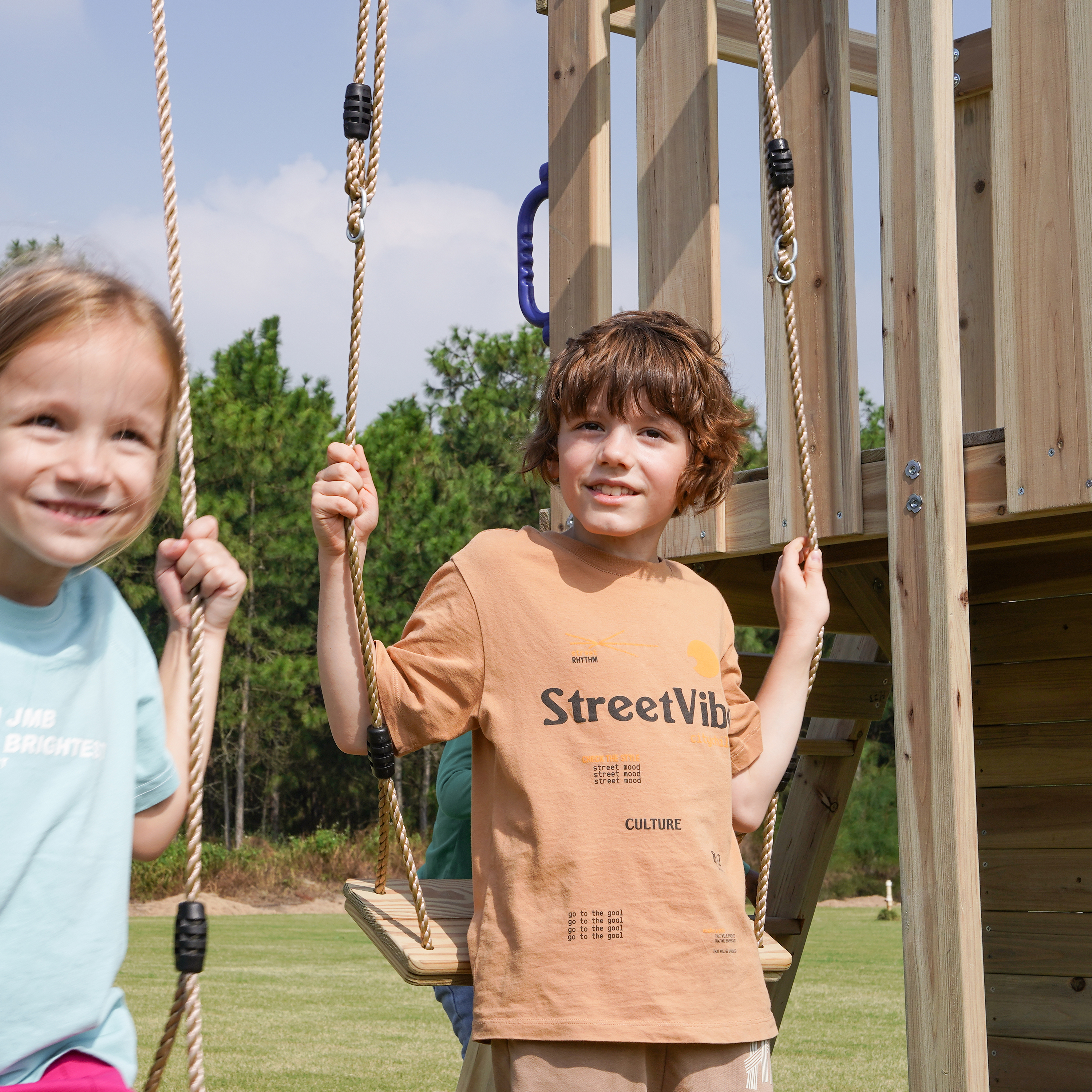 Neben der Aussicht vom Turm können Kinder beim Schaukeln ihre Freiheit genießen. Zum Glück müssen sie nicht alleine schaukeln, sondern können sie dies zusammen mit einem Freund tun. Moos hat nämlich eine Doppelschaukel mit zwei Schaukelsitzen aus Holz. Die braune Holzoptik verleiht diesem Spielturm einen natürlichen Look, der jeden Garten zum Strahlen bringt. Der Spielturm Moos hat eine Podesthöhe von 119 cm und ist mit einer beeindruckenden 220 cm langen Rutsche ausgestattet.