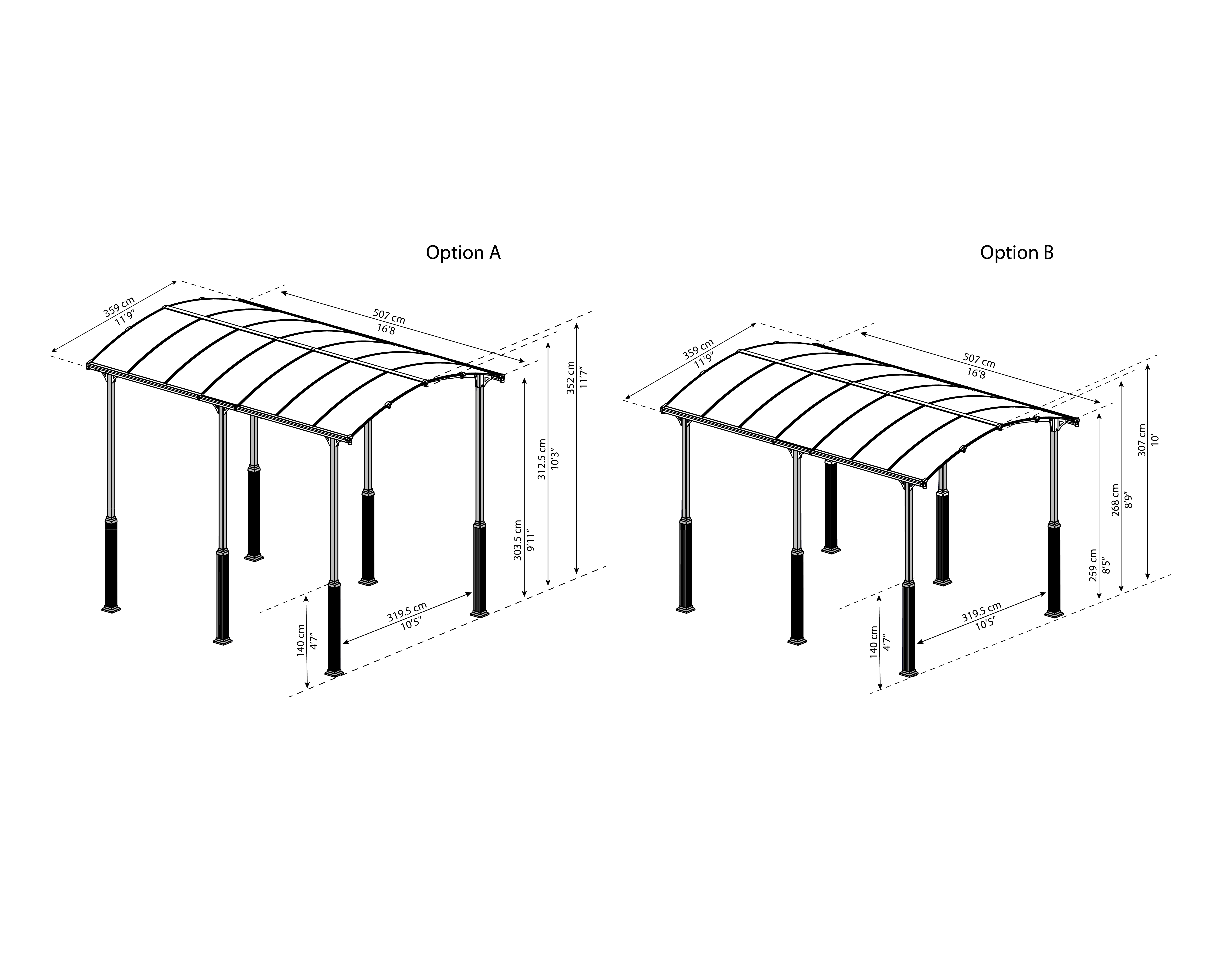 Der Alpine Carport ist eine hochwertige, stilvolle und langlebige Überdachung. Dieses Produkt bietet den Vorteil, dass es deine Fahrzeuge das ganze Jahr über vor schädlichen Einflüssen wie der UV-Strahlung der Sonne schützt. Es ist auch ein großer Vorteil, dass das Sonnenlicht durch die Überdachung dringt. Es ist so konstruiert, dass es auch hohen Fahrzeugen wie Wohnmobilen Schutz bietet. Gefertigt aus sehr widerstandsfähigen und wartungsfreien Materialien, bietet es erstklassigen Schutz, eine benutzerfreundliche Montage und ein Aussehen, auf das du stolz sein kannst. Und wie alle Canopia-Carports haben wir ihn für die Ewigkeit gebaut ... und damit auch dein Fahrzeug!